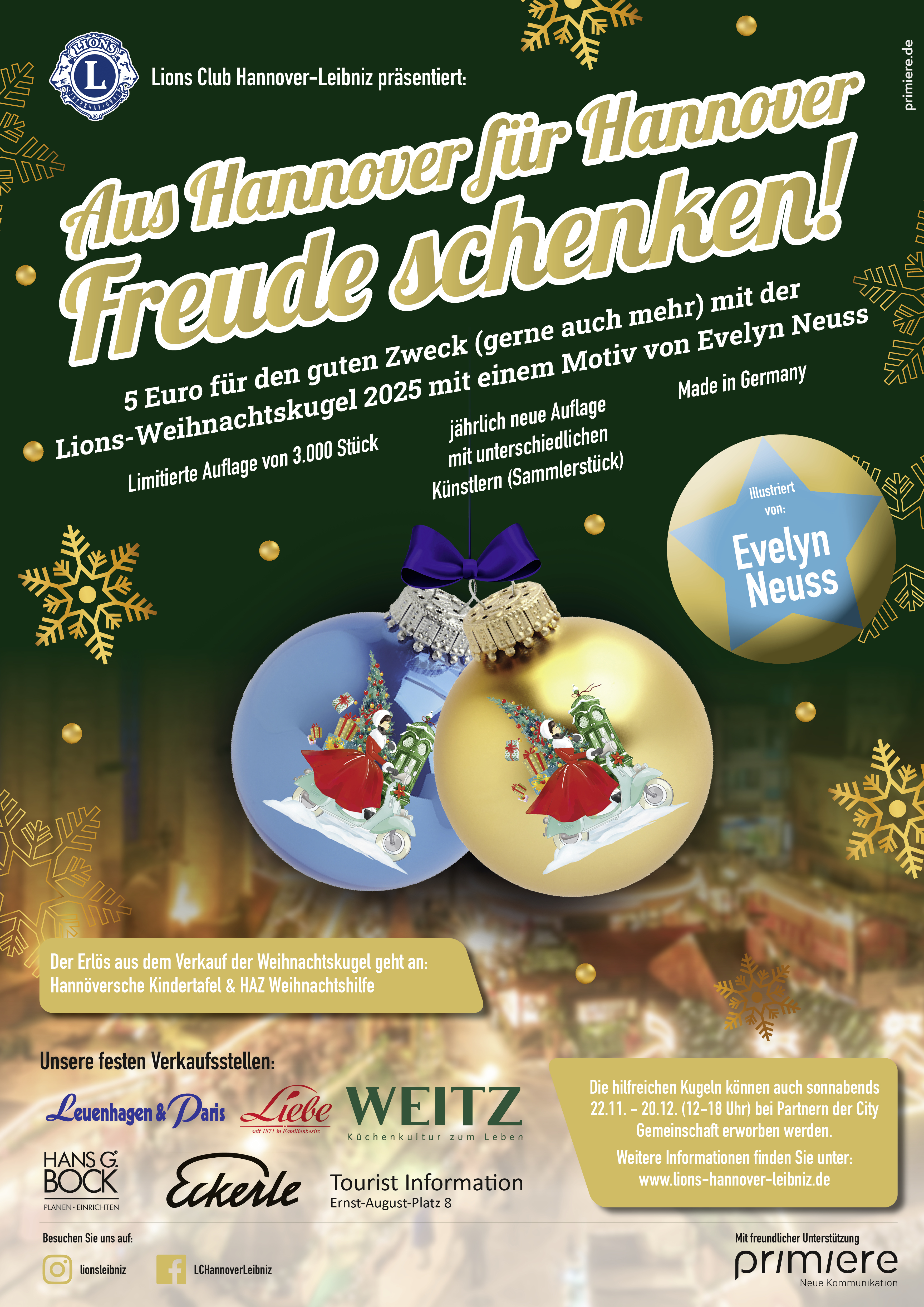 Der Lions Club Hannover-Leibniz bringt dieses Jahr die 5. Lions Weihnachtskugel für den guten Zweck auf den Markt. Die Weihnachtskugel ist von der bekannten hannöverschen Illustratorin und Architektin Evelyn Neuss in einem dynamischen und lebendigen Design exklusiv für uns gestaltet worden.